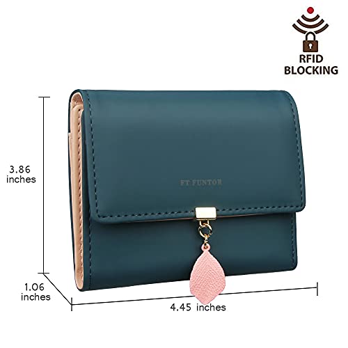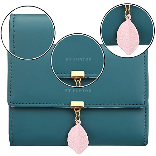 FT FUNTOR PU Leather Wallet for Women RFID-Blocking, Ladies Bifold Leaf Pendant Coin Zipper Small Purse with 5 Card Slots and 1 ID Window Card Holder Organizer(S-Teal Blue)