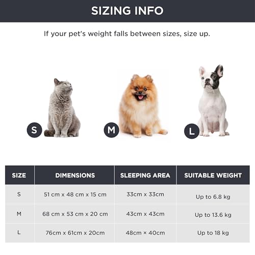 Size: Measuring 63x53x20cm, this cat bed is the ideal Christmas gift for small dogs/cats of any age. The maximum weight capacity for this S-size bed is up to 6.8kg,M-size is up to 13.6kg and up to 18kg for L size.